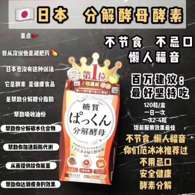 日本分解酵母/酵素 范冰冰也在吃哦!!想效果明显就一天三次每次两颗来个分解脂肪的 范冰冰自用冰冰别再推荐了 我们要没饭吃了 推啥断啥 来不及哦哈哈哈又要火的一款 范冰冰推荐 必火产品!!日本Svelty糖质分解断油断糖分解油糖酵母酵素 120粒装主要成分:壳聚糖 酵母菌 白芸豆提取物 乳糖 匙羹藤 乌龙茶提取物 藤黄果提取物 翅英决明等
