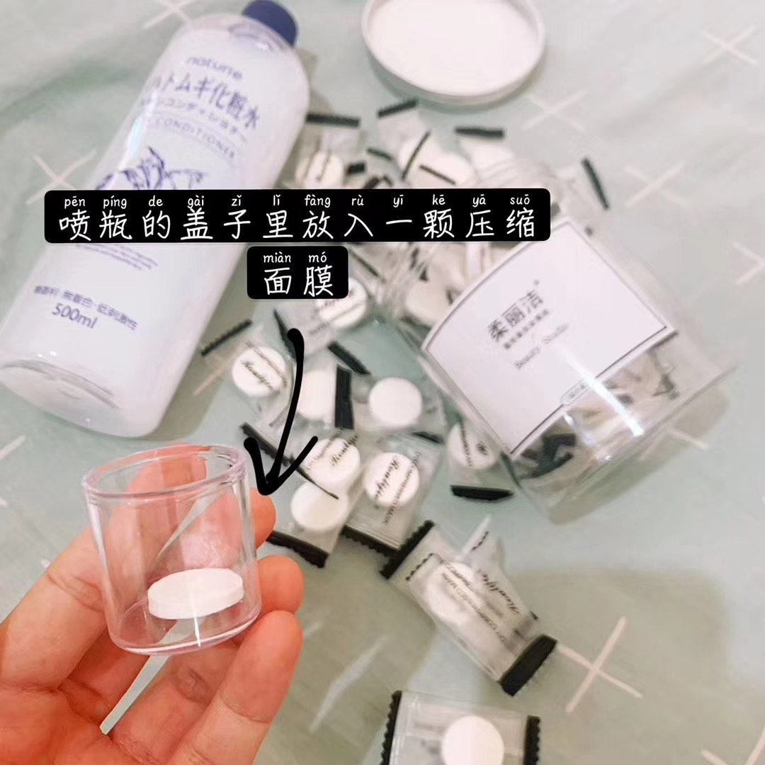 压缩面膜,一盒50个!送喷瓶!取出面膜放在喷瓶的盖子里,倒入精华或爽肤水,取出就可以开始敷啦~被称作会呼吸的面膜纸,质地透薄柔软,解决肌肤缺水问题,质感丝滑,给你的肌肤不一样的水润,蚕丝工艺,无漂白,40万个透气孔,让肌肤自由呼吸~