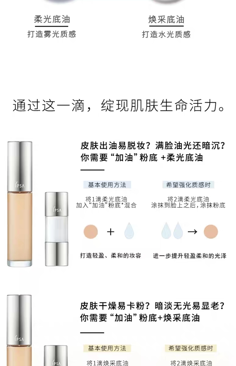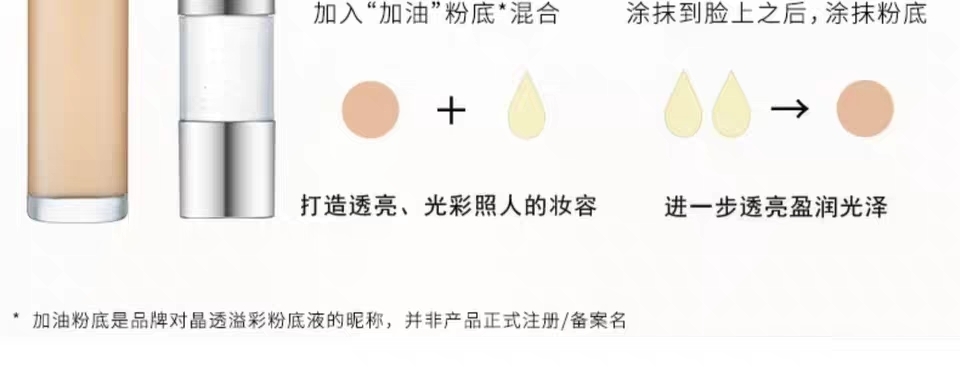 3.基本使用方法:将1滴焕采底油加入粉底液中混合 打造透亮光采的妆容