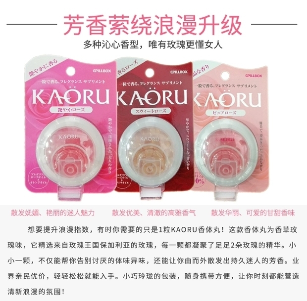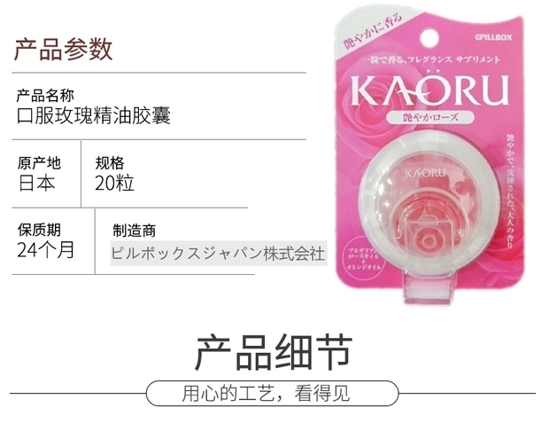 本品是香艳优雅的玫瑰香型与甘甜的香草香型融合一起的玫瑰精油产品。华丽优雅的玫瑰香型与甘甜的香草气味融合一起,充分表现女性魅力。100%的使用保加利亚产玫瑰,并配合香草精油而制成。名贵的保加利亚玫瑰,3000kg的花瓣仅能提炼出1kg精油。服用1粒就能浑身散发有人的玫瑰芳香。每日服用,可以去除口臭和体味,使您的浑身散发着玫瑰香气,被称为口服香水。