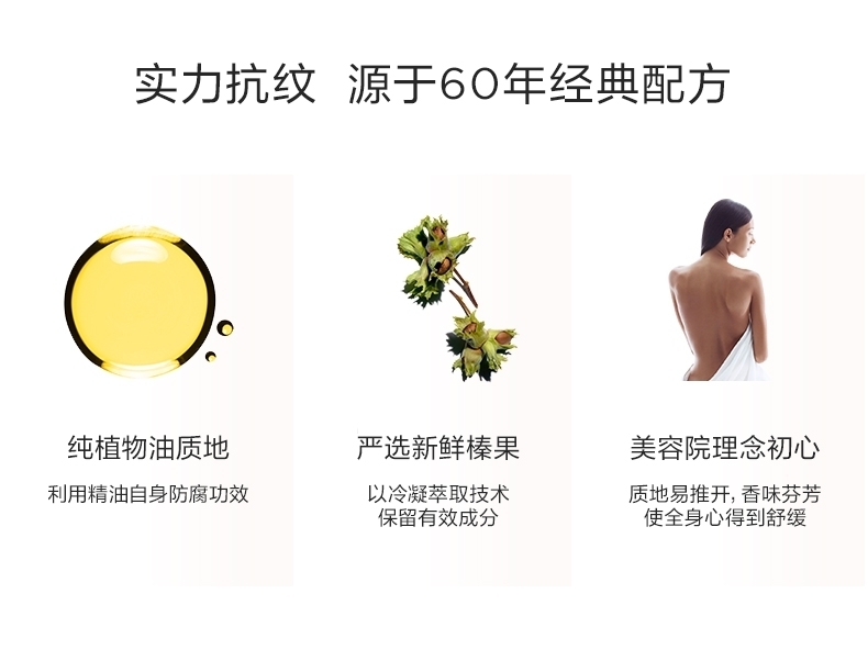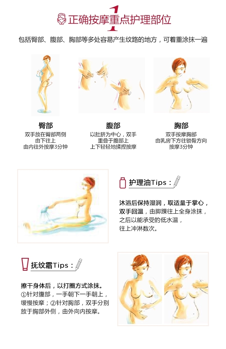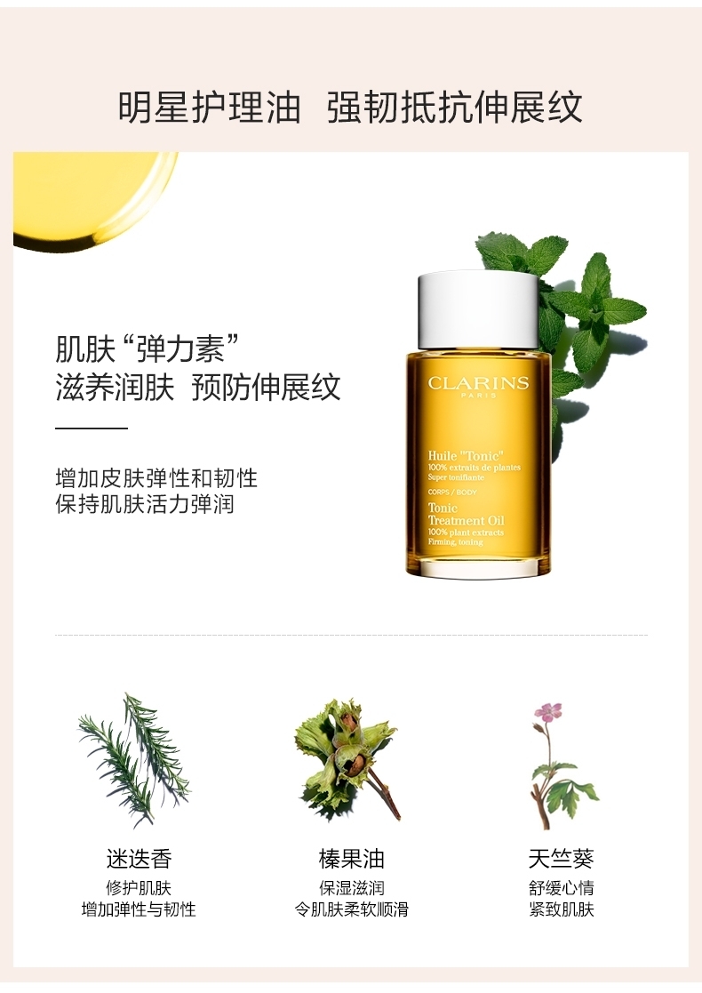 淡化孕期纹路 增强肌肤弹性 妊娠纹一旦产生,就无法完全消除,只能修复淡化,因此提前预防更为重要。100%植物提取液 预防及淡化妊娠纹 以榛实果油为基础油,混合了高浓缩的植物精油。100%纯植物精华,富含维他命A和E,紧致肌肤,特别推荐给怀孕期的女性,有效预防及淡化妊娠纹,令其肤色均匀,柔软顺滑。