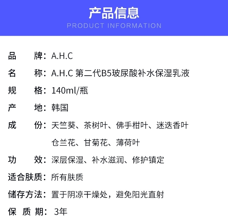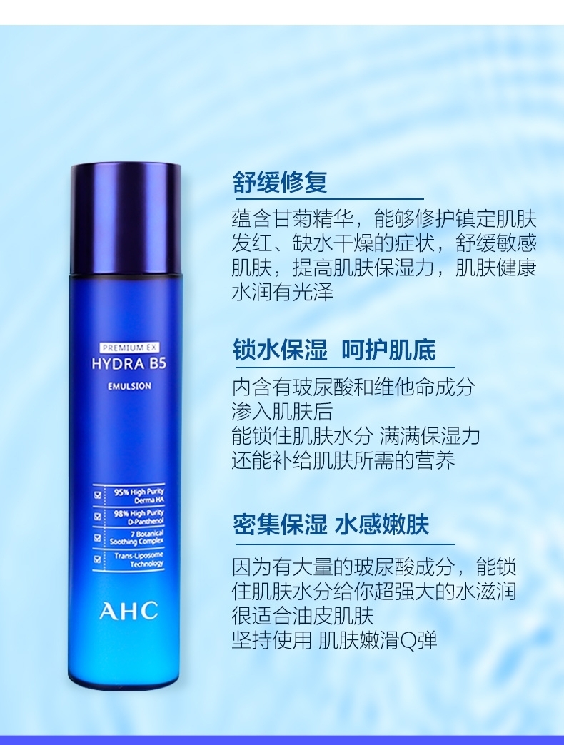 美白、补水、保湿、舒缓、敏感 ,B5玻尿酸大家都熟悉了是AHC的王牌,更是AHC的天下基础护肤重要的一步——补水保湿,可以保持皮肤润泽细嫩光滑,高效保湿补水,提供肌肤所需的营养,还可以舒缓敏感哈,秋季来了,舒敏就是最大问题,此款质地一年四季都是完全可以用!