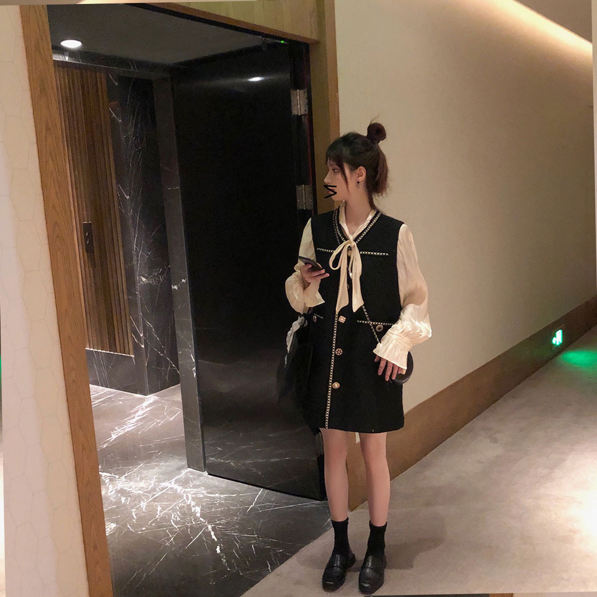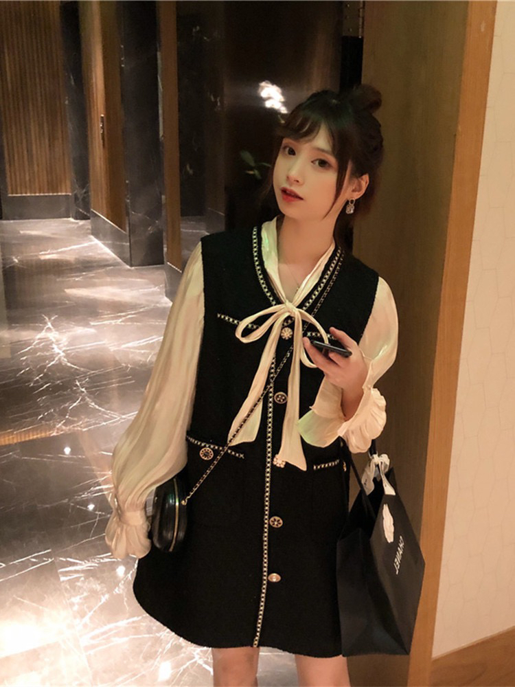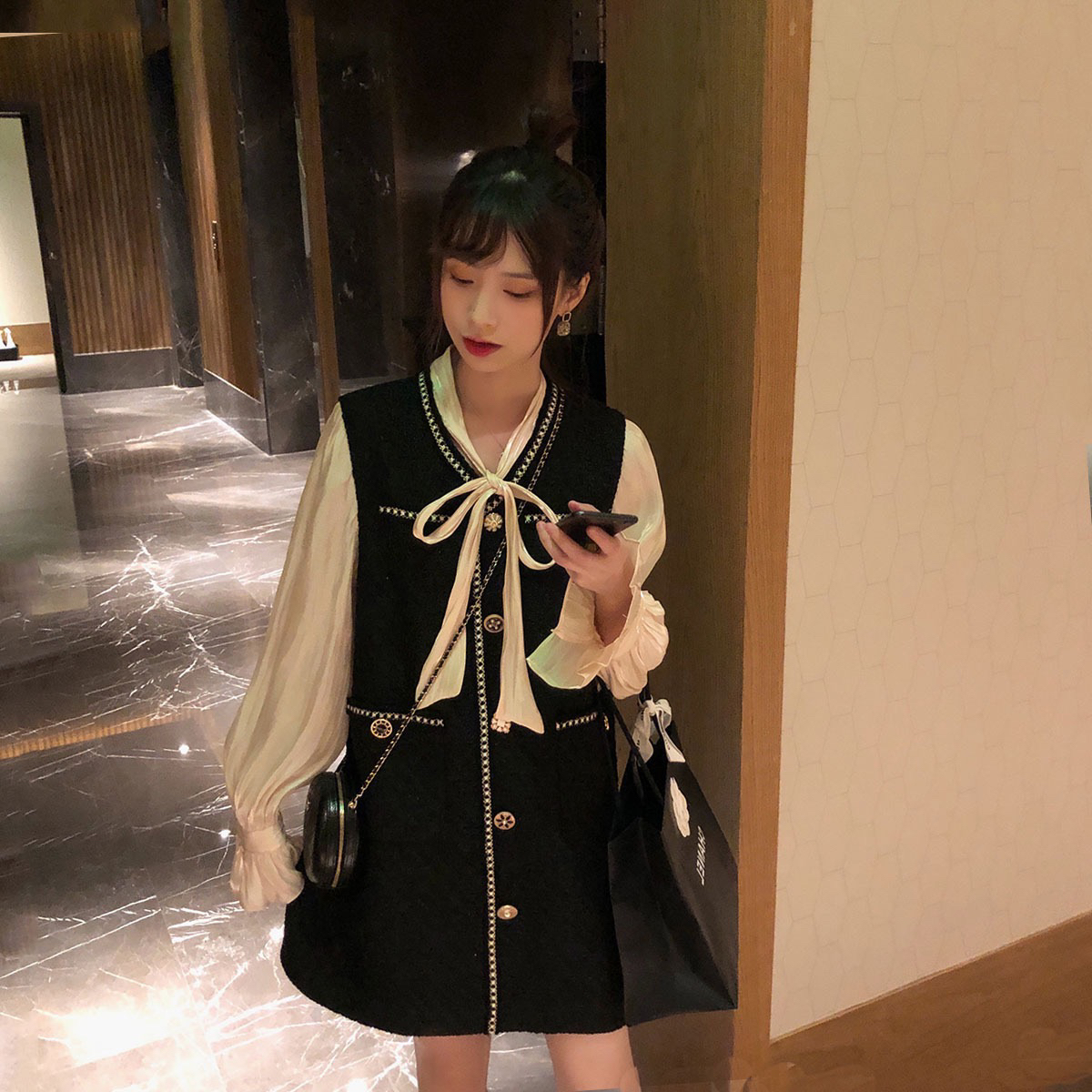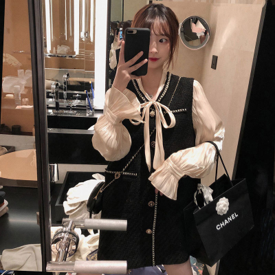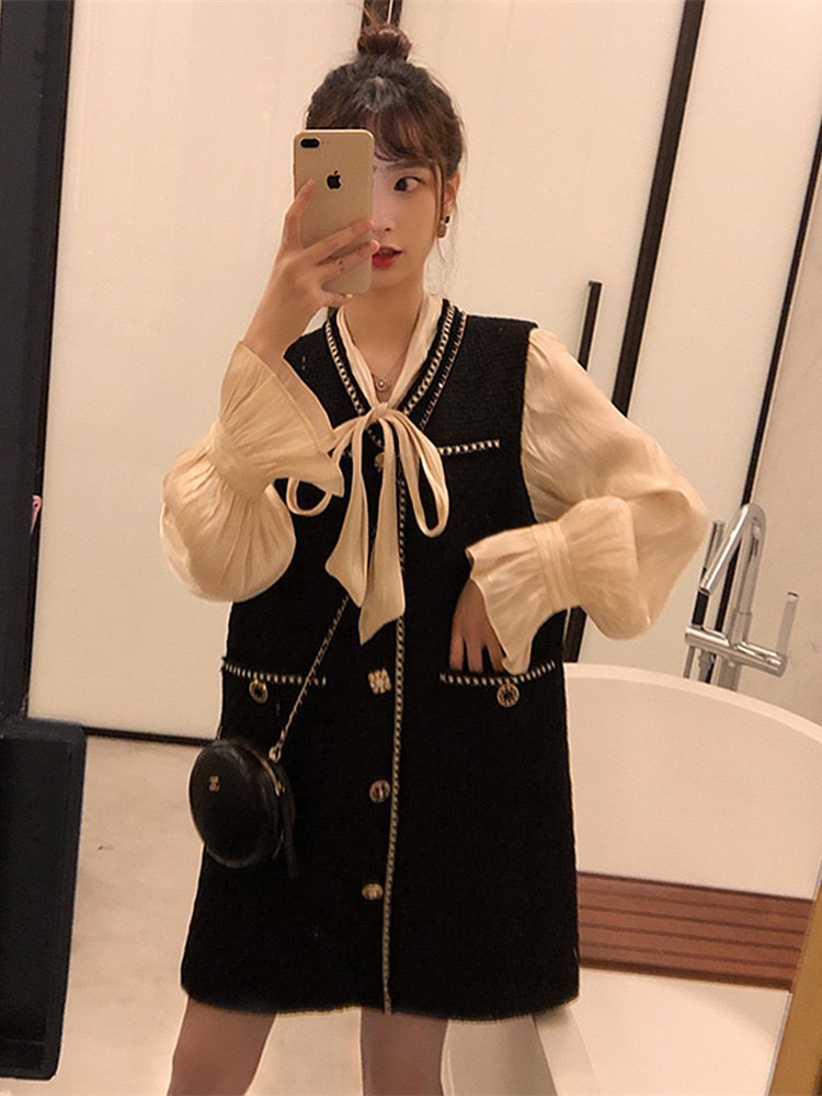 22)预定特价:小香风裙子2020秋装赫本风气质假两件连衣裙女韩版温柔小个子短裙