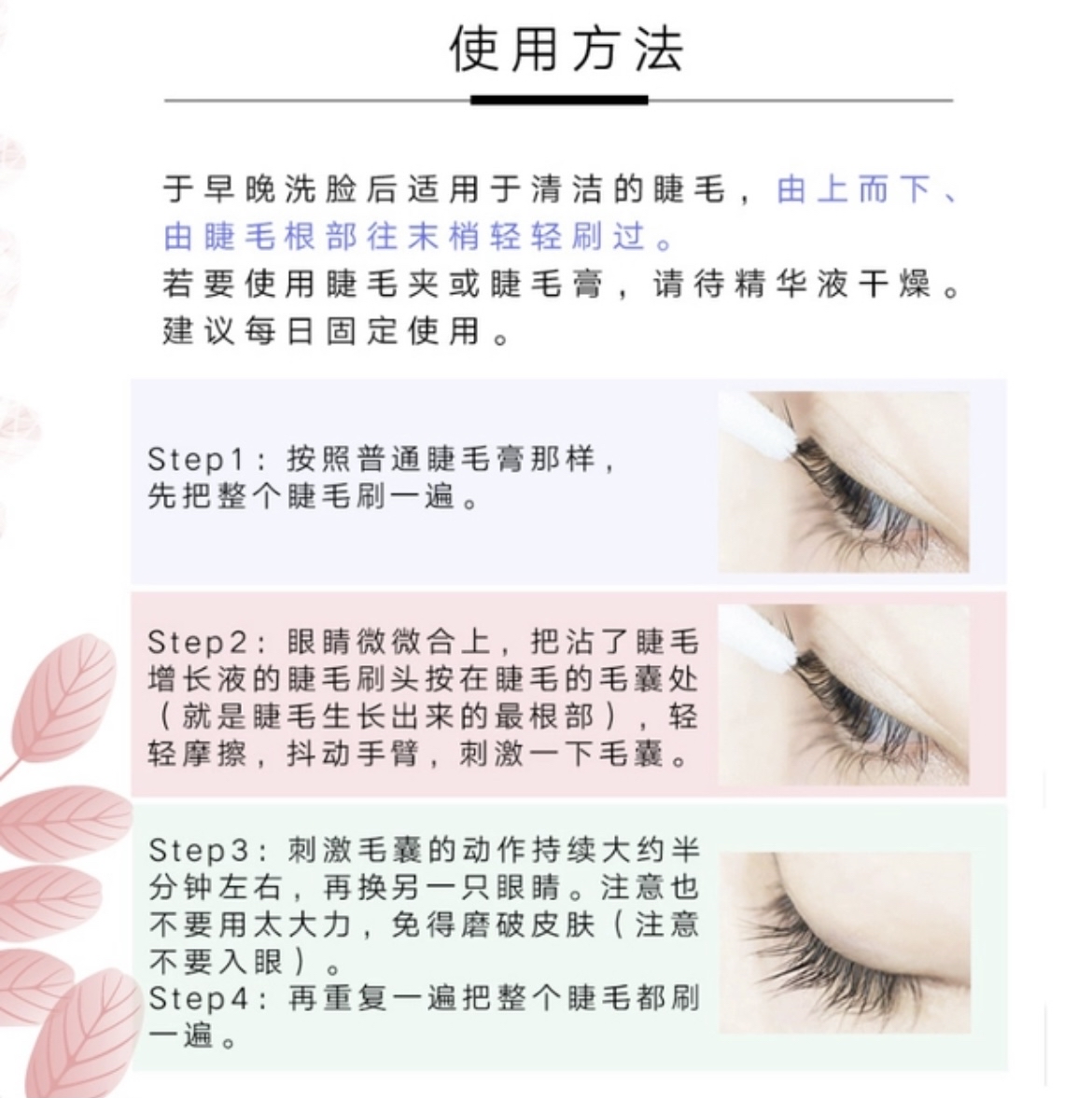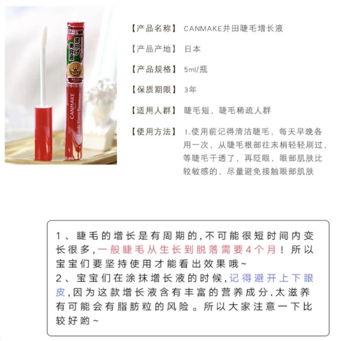 睫毛的增长是有周期的,不可能很短时间内变长很多,一般睫毛从生长到脱落需要4个月!所以宝宝们要坚持使用才能看出效果哦〜宝宝们在涂抹增长液的时候,记得避开上下眼皮,因为这款增长液含有丰富的营养成分。太滋养有可能会有脂肪粒的风险。所以大家注意一下比较好哟〜